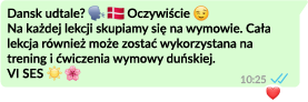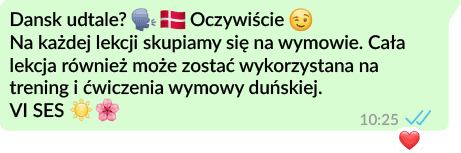 Kursy dopasowywane są indywidualnie pod potrzeby ucznia lub grupy. Wspólnie ustalamy w jaki sposób chcesz aby przebiegała nasza lekcja. W zależności od poziomu zaawansowania zajęcia będą przebiegały wyłącznie w języku duńskim lub w trybie mieszanym (polsko-duńskim) na niższych poziomach. Na lekcjach ze mną nie zabraknie słuchania duńskich wiadomości, analizowania duńskich filmów i seriali, czy chociażby odsłuchiwania duńskich utworów muzycznych.